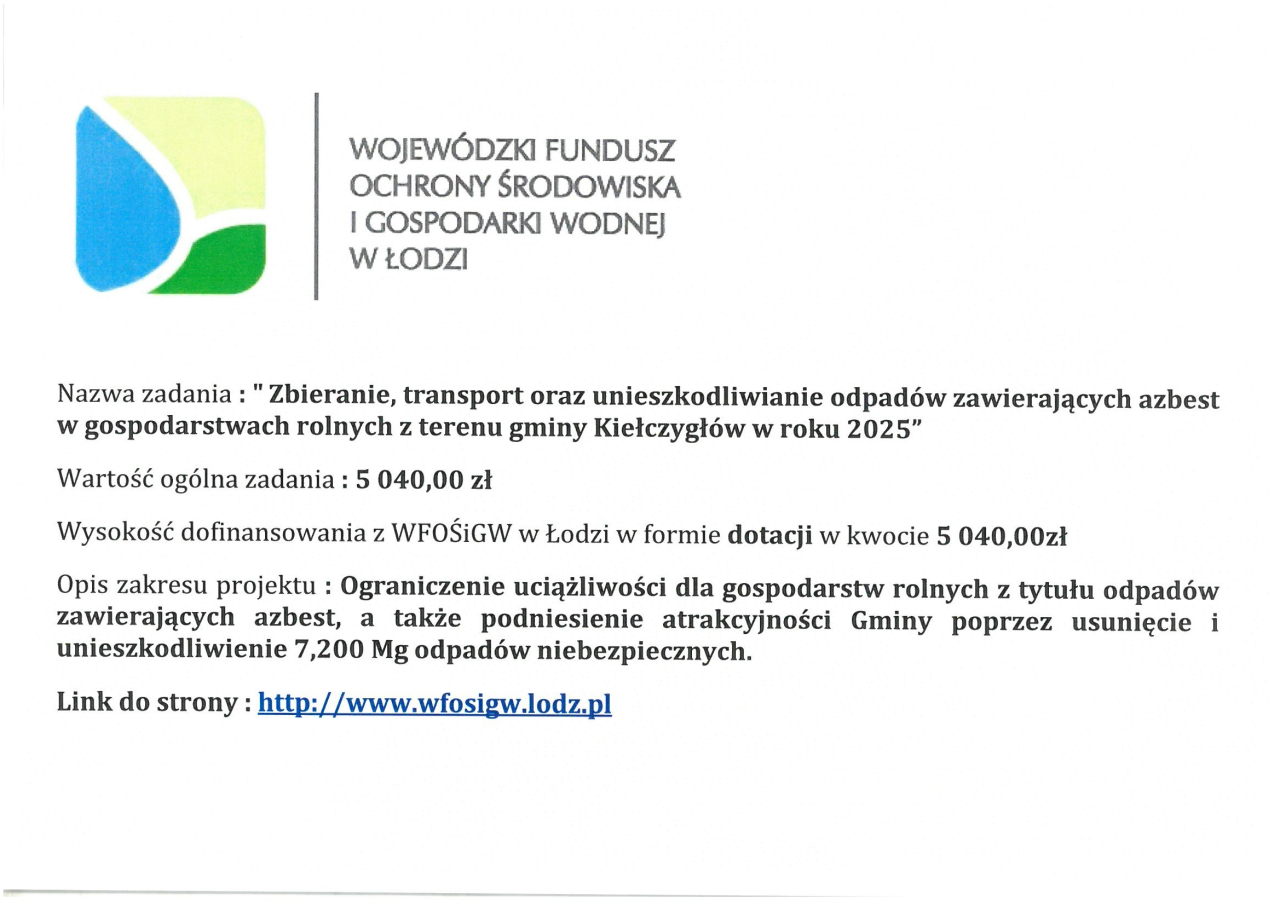 Zbieranie, transport oraz unieszkodliwianie odpadów zawierających azbest w gospodarstwach rolnych z terenu gminy Kiełczygłów w roku 2025