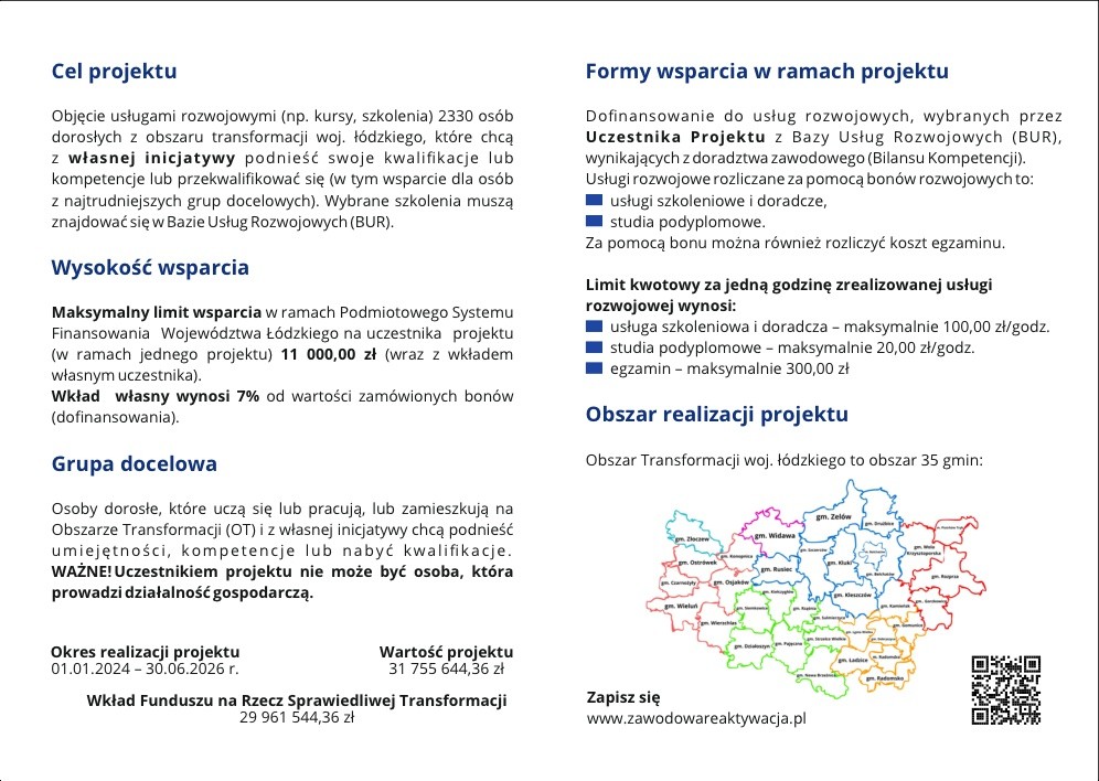 Projekt „Zawodowa reaktywacja” daje możliwość otrzymania dofinansowania do 11 tyś. zł na kursy i szkolenia dostępne w Bazie Usług Rozwojowych i skierowany jest do osób, które zamieszkują bądź pracują bądź uczą się na terenie objętym transformacją. Podczas spotkania chcemy przybliżyć osobom zainteresowanym zagadnienia związane z udziałem w w/w projekcie oraz przedstawić proces składania zgłoszeń do projektu.