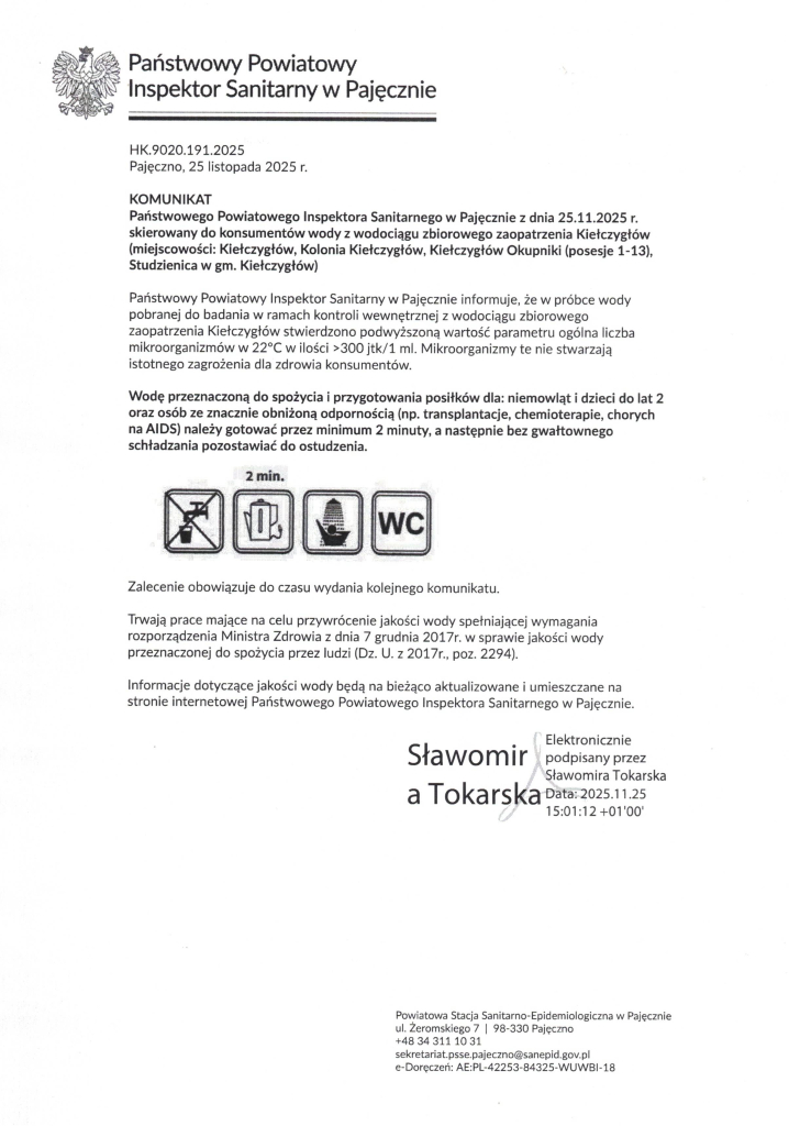 UWAGA Mieszkańcy miejscowości: Kiełczygłów, Kolonia Kiełczygłów, Kiełczygłów - Okupniki posesja od nr 1 do nr 13 i Studzienica poniżej WAŻNY komunikat