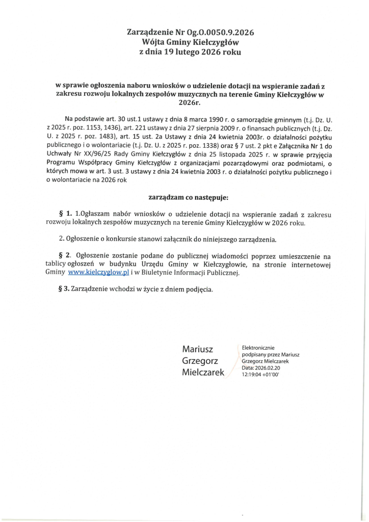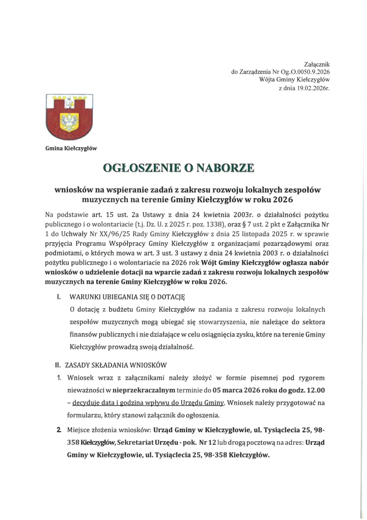 Ogłoszenie o naborze wniosków o udzielenie dotacji na wspieranie zadań z zakresu rozwoju lokalnych zespołów muzycznych na terenie Gminy Kiełczygłów na 2026r.