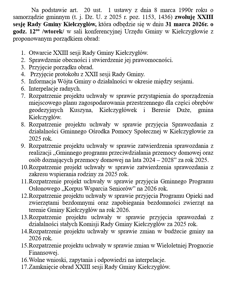 Informacja o zwołaniu XXIII sesji Rady Gminy Kiełczygłów