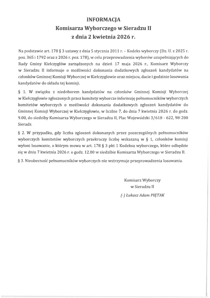 Informacja Komisarza Wyborczego w Sieradzu II z dnia 2 kwietnia 2026 r.