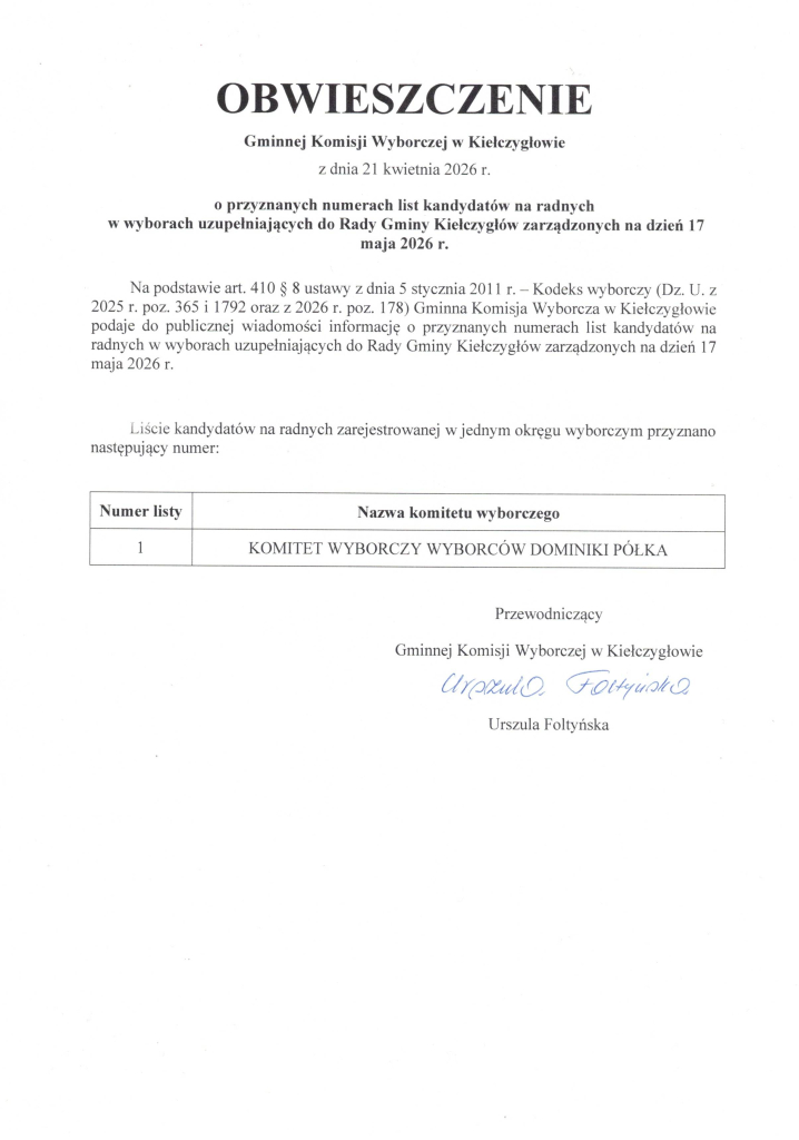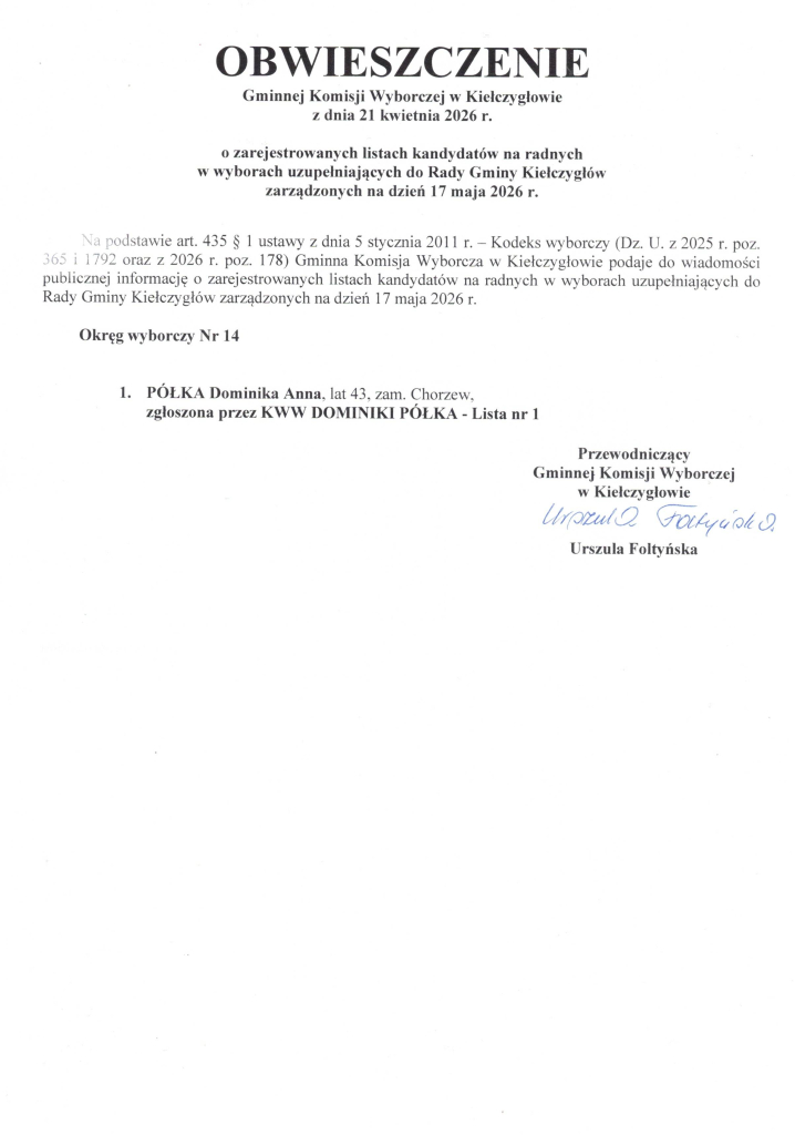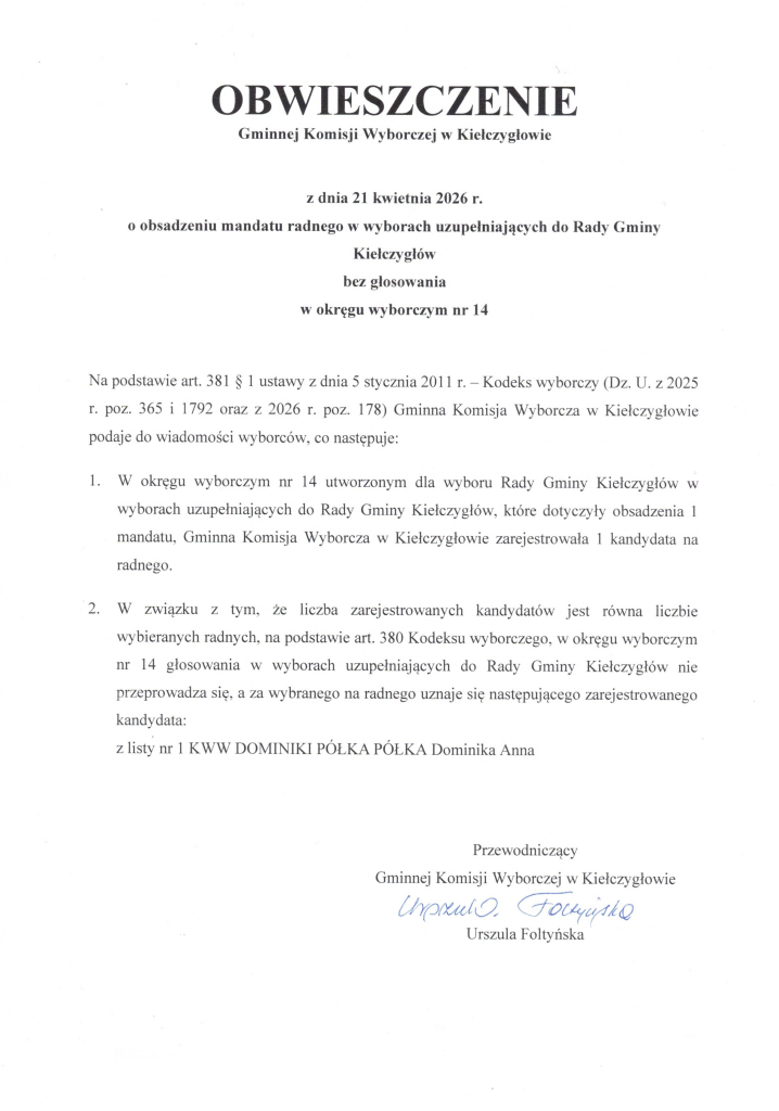 obwieszczenia Gminnej komisji Wyborczej w kiełczygłowie z dnia 21 kwietnia 2026 r.