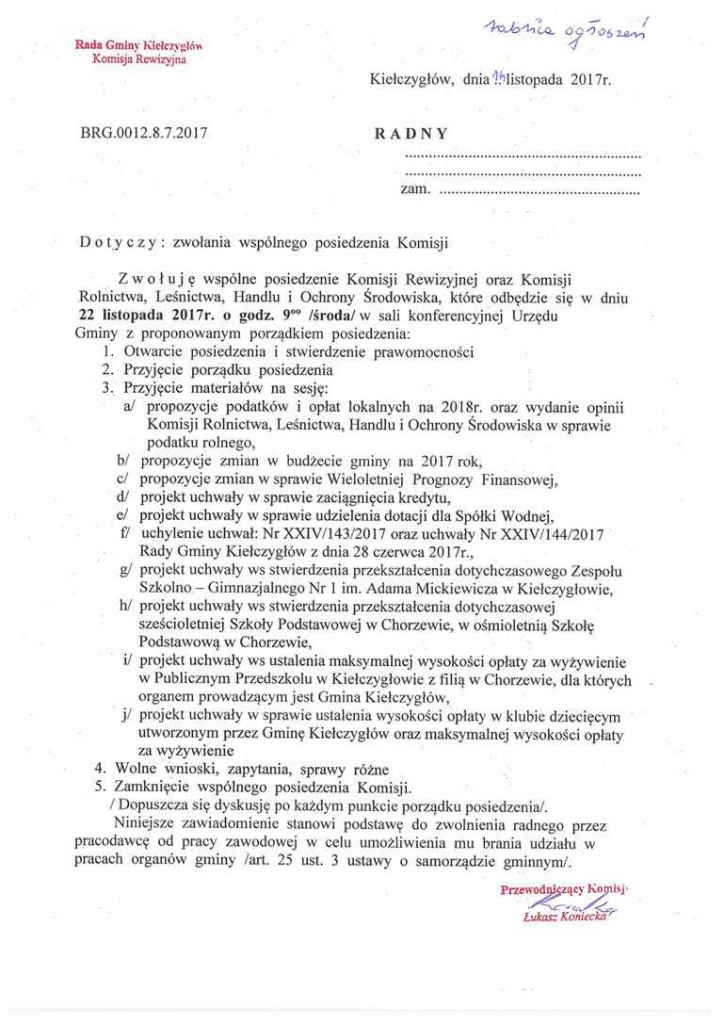 ZWOŁANIE XXVI SESJI RADY GMINY KIEŁCZYGŁÓW ORAZ WSPÓLNEGO POSIEDZENIA KOMISJI