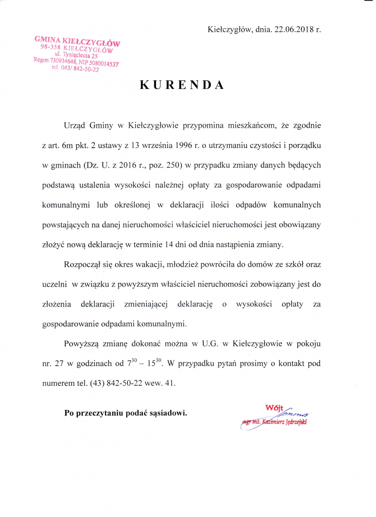 Kurenda - Zmiana deklaracji o wysokości opłaty za gospodarowanie odpadami komunalnymi na okres wakacyjny.